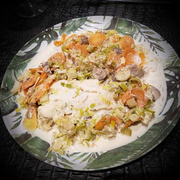 Ajouter 150g de champignons de Paris et 4 parts de dos de cabillaud. Laisser cuire 5min. Presser un citron et verser par-dessus.