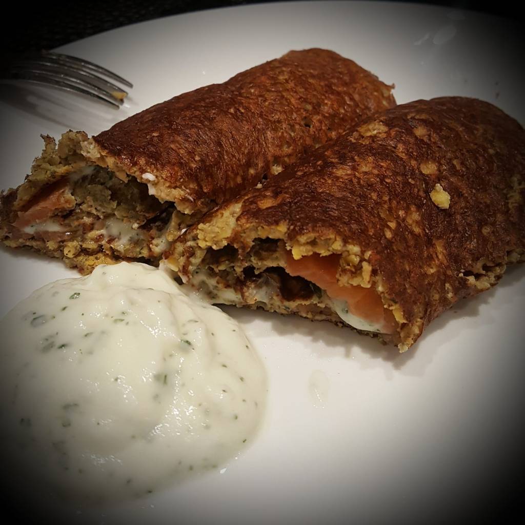 Au moment de passer à table, étaler une crêpe, mettre une tranche de saumon et rouler. Déguster avec 2 CS de yaourt.