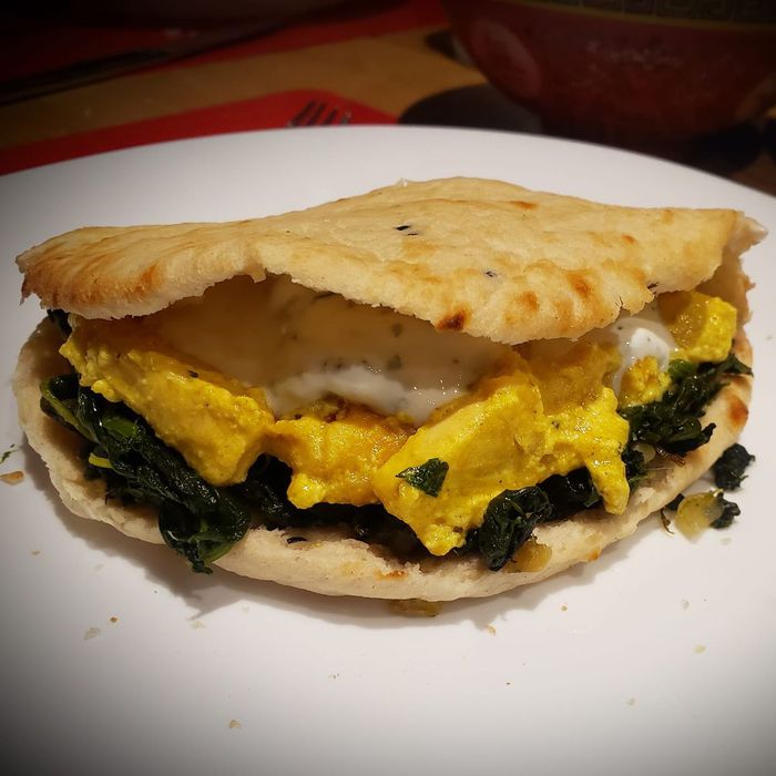 Faites réchauffez les naans 2 min au grille-pain, ouvrez-les en 2 et garnissez-les avec le poulet et les épinards, et ajoutez 1 cuil. à soupe de yaourt mélangé avec un peu d’herbes.