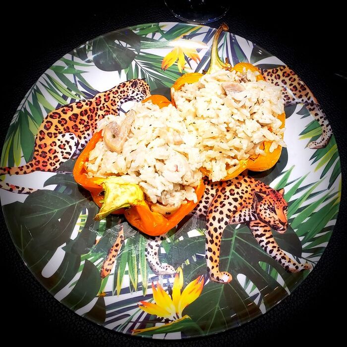 Quand les poivrons sont cuits, mélanger le riz avec le poulet, remplir les poivrons cuits et servir accompagné d’une petite mâche assaisonnée d’huile d’olive et de balsamique.