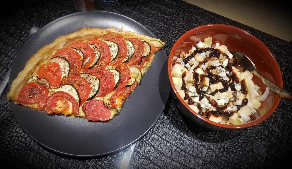 Étaler une pâte feuilletée dans un moule à tarte. Répartir la moutarde dans le fond. Saupoudrer de gruyère râpé. Disposer en rosace des tranches de tomates et de courgettes. Émietter du thym frais, saler, poivrer et enfourner 30min à 210°.