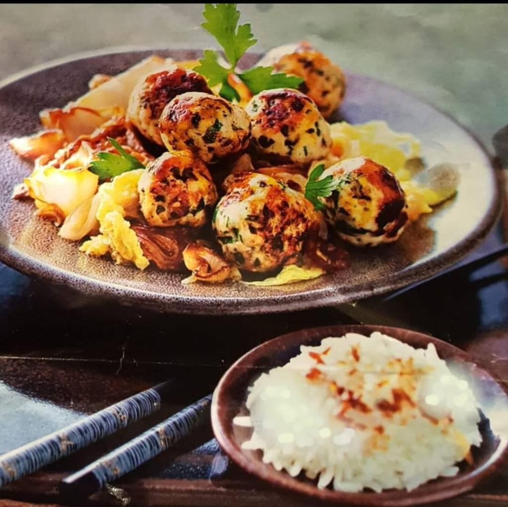 A part, ciseler un chou chinois. Le plonger dans de l’eau bouillante 5min. Égoutter et le faire revenir dans une poêle avec l’oignon émincé préalablement revenu dans de l’huile d’olive. Si vous avez sauvegardé un peu de coriandre, l’ajouter au mélange avec une rasade de nuoc mam et de sauce soja.