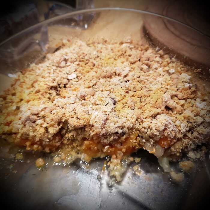 Verser les légumes dans un plat à gratin, recouvrez du sablage et enfourner 45min à 180°.