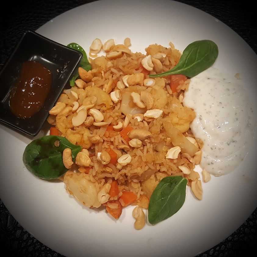 Servir parsemé d’une poignée de noix de cajou agrémenté de la sauce yaourt et d’un chutney d’abricot (que j’ai acheté tout fait j’avoue