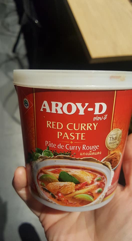 Dans un wok, mettre l’huile neutre, la pâte de curry rouge (voir photo celle que j’achète chez Tang, c’est la meilleure et elle existe en vert un peu moins forte). Faire rissoler un peu.