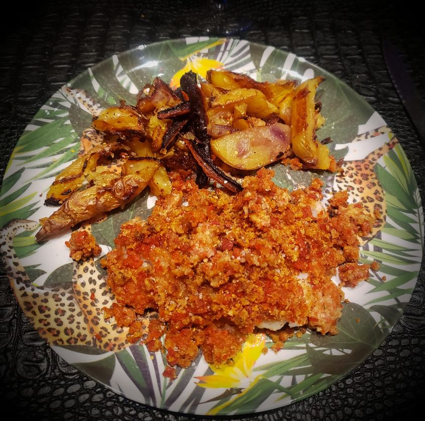 Déposer les morceaux de cabillaud dans un plat allant au four, couvrir de crumble et enfourner 15min.