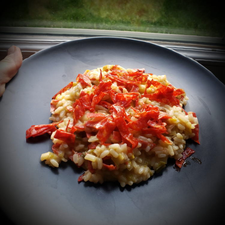 Servir et ajouter sur le dessus quelques lamelles de chorizo.