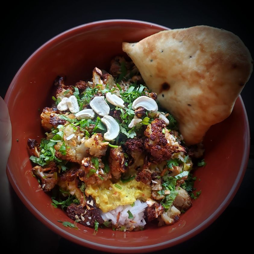 Disposer le riz dans une assiette creuse ou un bol, ajouter le dahl de lentilles, le chou-fleur rôti. Saupoudrer de coco râpée, quelques noix de cajou et de la coriandre. Servir accompagné d’un morceau de naan.