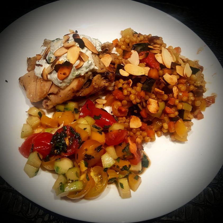 Répartir le couscous dans l’assiette, ajouter le poulet, servir la salade à côté. Répartir quelques amandes et 1 CS de yaourt coriandre.