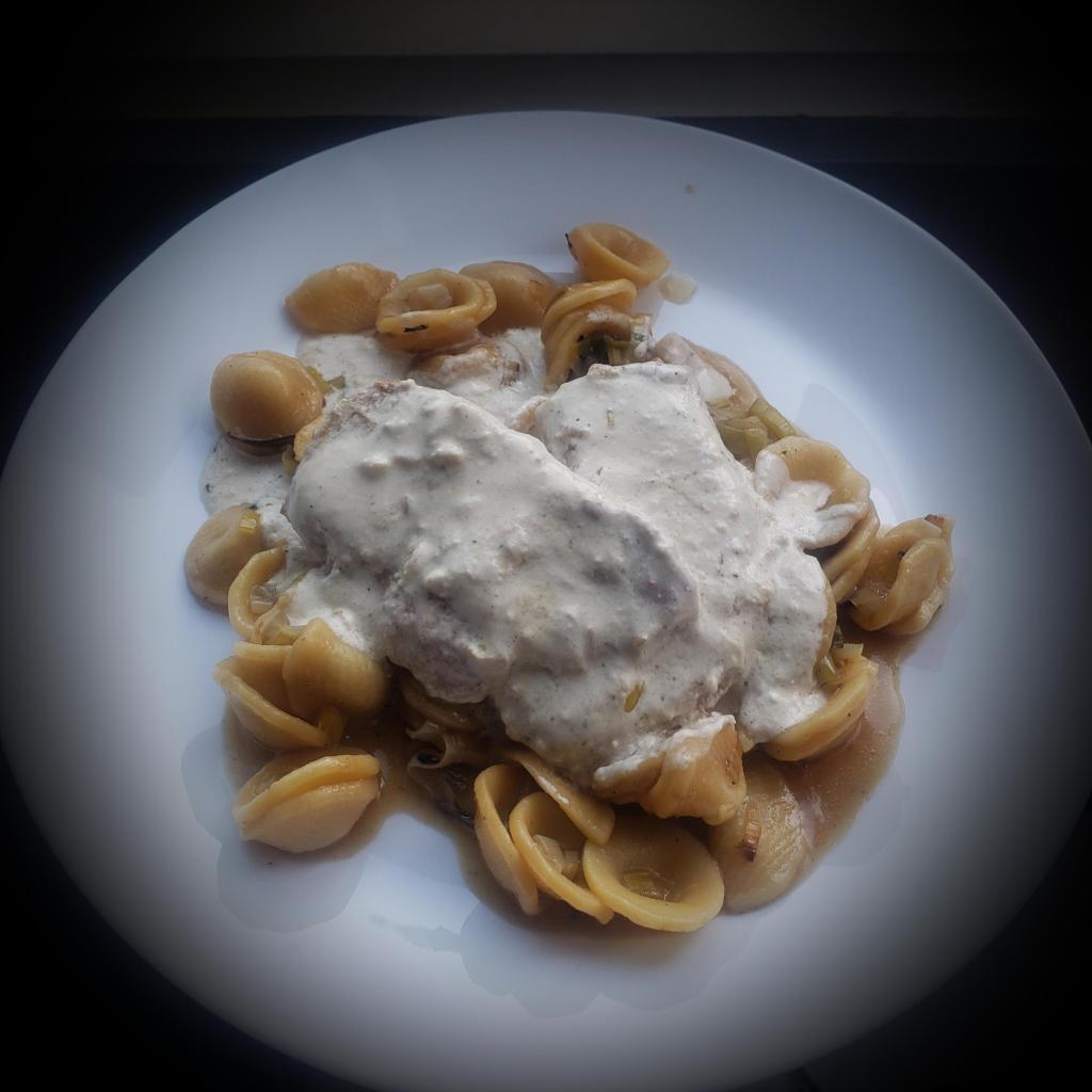 Filets de porc couchés sur ces petites pâtes italiennes en forme d’oreille et originaires de la région des Pouilles en Italie