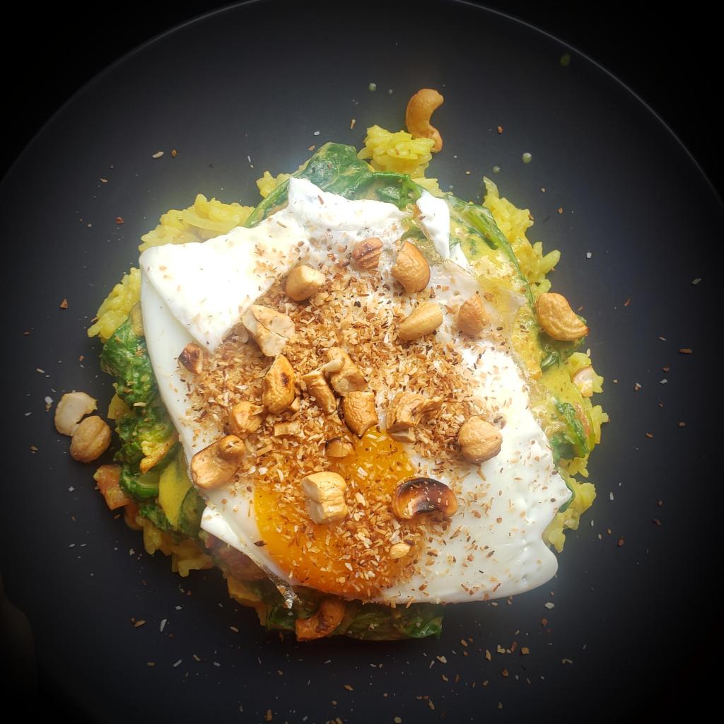 Servez le riz puis les épinards sur le dessus puis disposez l’œuf au plat. Saupoudrez avec les noix de cajou et la noix de coco râpée.