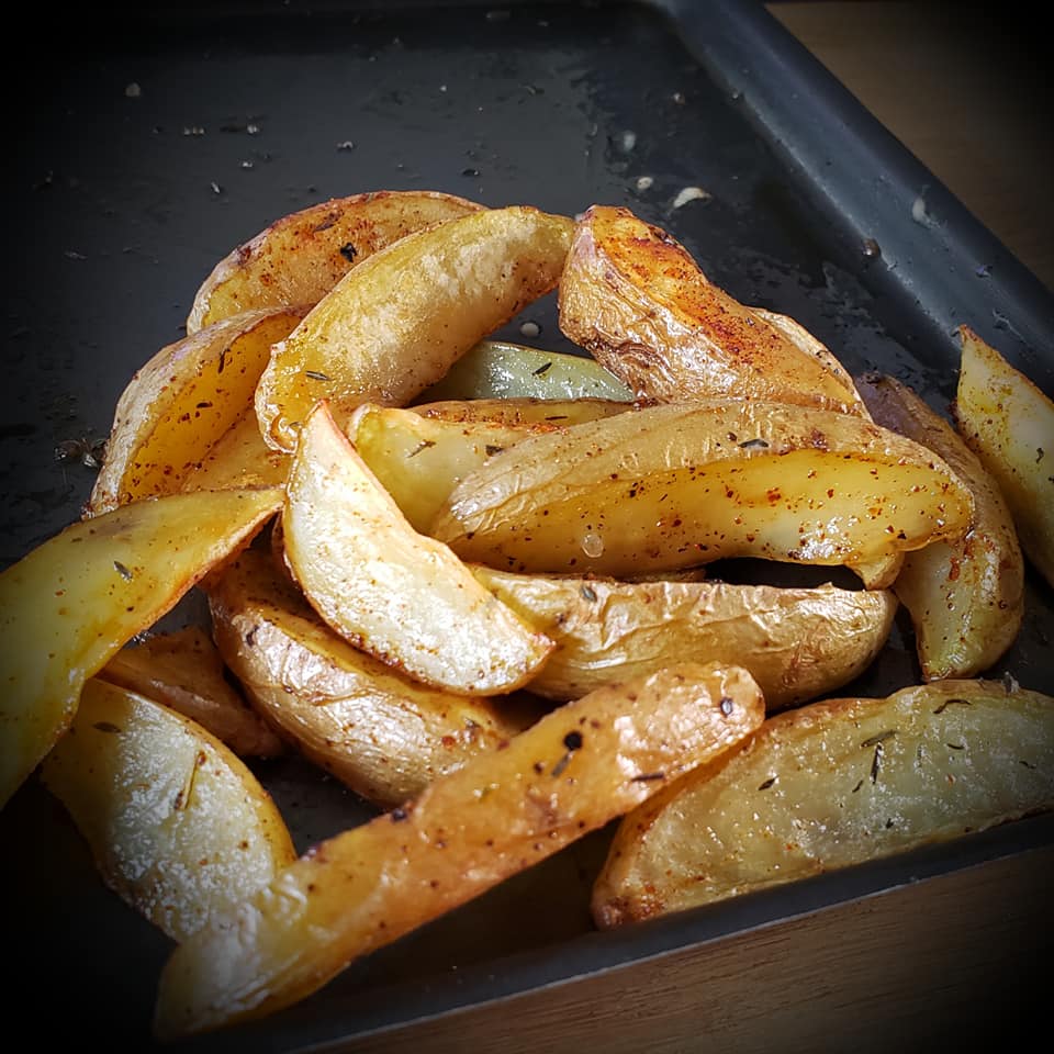 Couper les pommes de terre en petits quartiers. Les disposer sur une plaque allant au four. Saupoudrer de sel, poivre, thym, paprika et arroser d’un filet d’huile d’olive. Enfourner 30 min à 200° (jusqu’à ce qu’elles soient dorées à souhait).