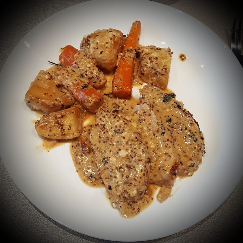 Servir le filet en tranches, disposer pomme de terre et carottes autour et arroser de sauce.