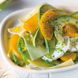 Superposer lasagne, romaine, avocat, pêche et mozza. Recommencer 2 fois.