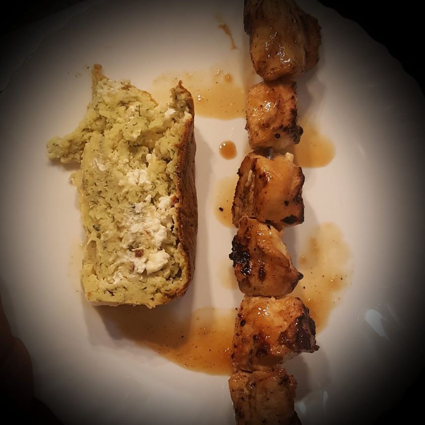 Servir la brochette arrosée de la marinade avec une tranche de terrine. Déguster.