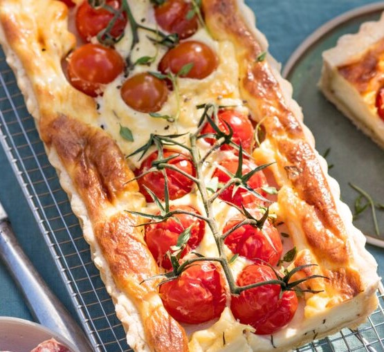 Répartissez le fromage en morceaux sur la pâte, versez les œufs battus et posez les grappes de tomates. Enfournez pour 35 min.