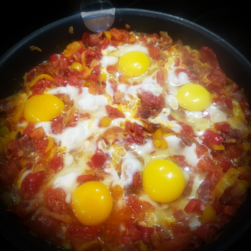 L’onctuosité de l’œuf coulant qui épouse à merveille la douceur acidulée du poivron et de la tomate…