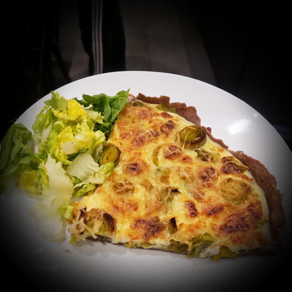 Déposer la feuille avec la pâte étalée dessus dans le moule. Ajouter les poireaux compotés, le mélange œufs, lait, crème et saupoudrer de gruyère râpé. enfourner 30min.
