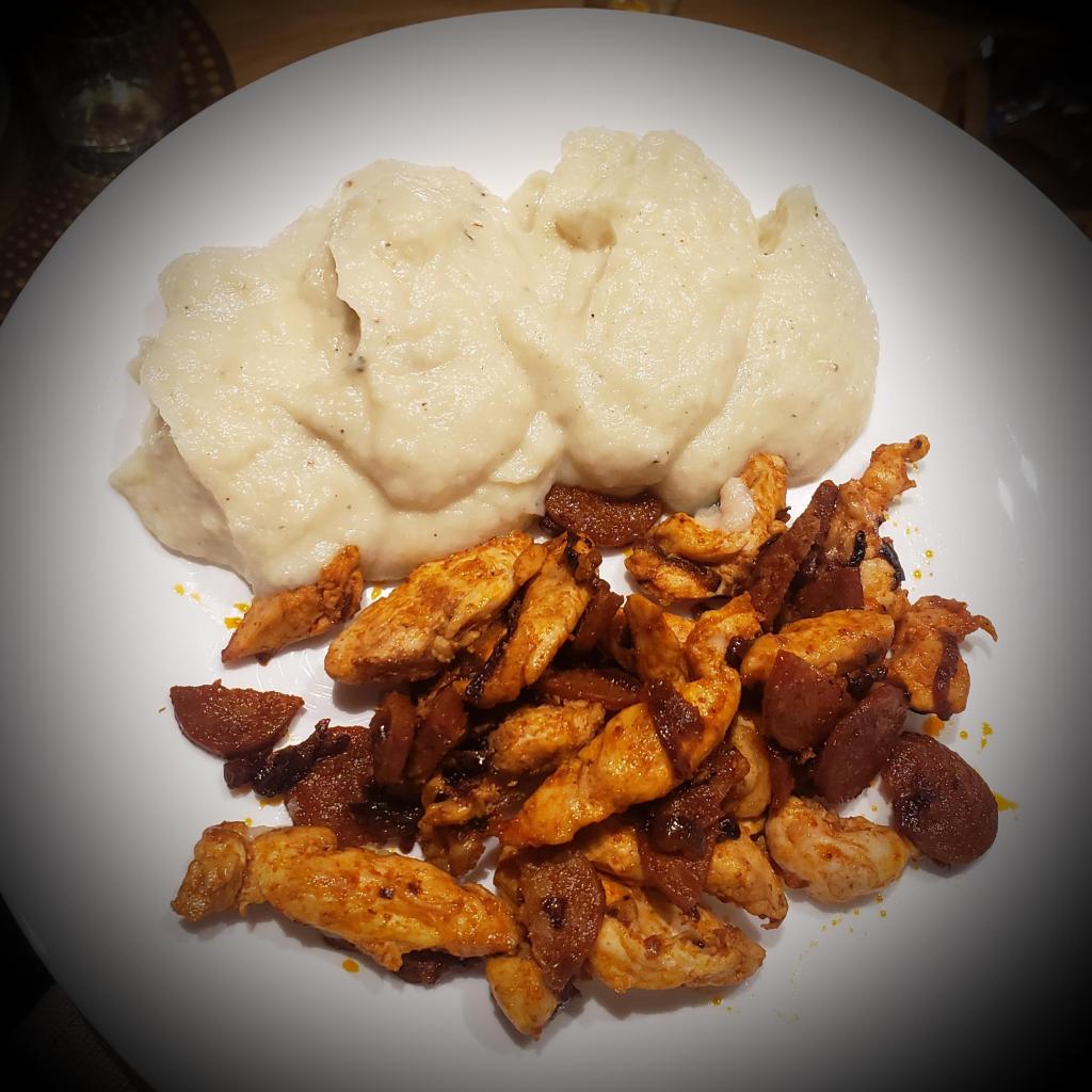 Déguster poulet au chorizo et purée de chou-fleur.