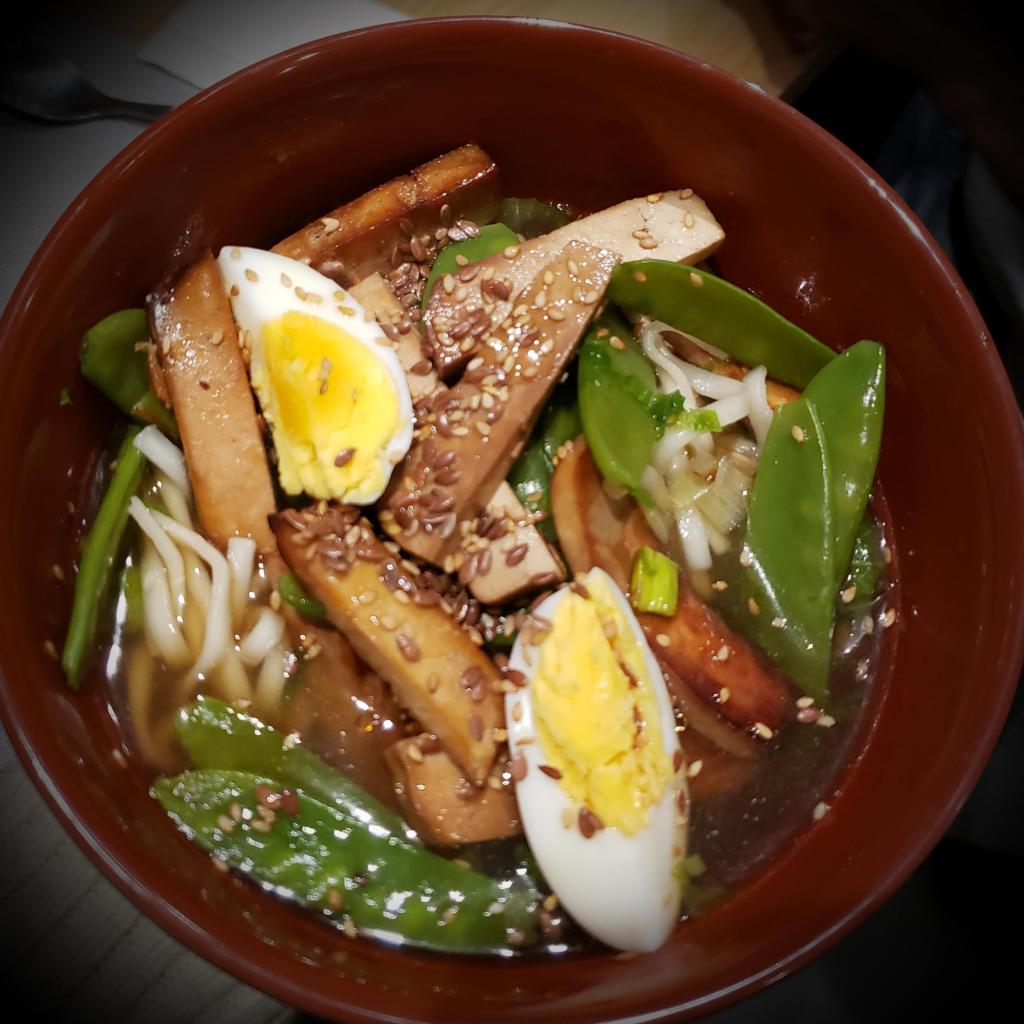 Verser le bouillon chaud dans un bol. Ajouter les nouilles égouttées, 1/2 œuf dur par personne, quelques lamelles de tofu laqué. Répartir les pois gourmands, le céleri et le poireau.