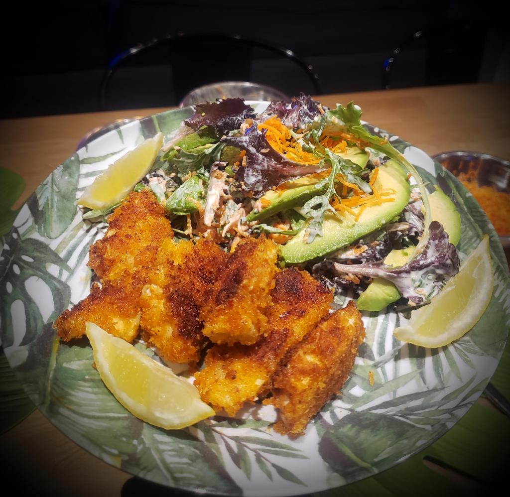 Un poulet croustillant accompagné d’un joli mélange de crudités dans une sauce douce et citronnée