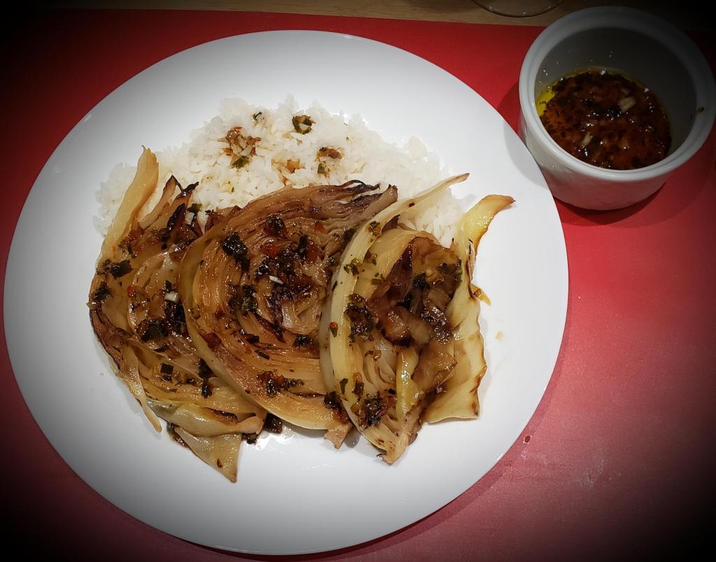 Dans une assiette, verser un peu de riz, quelques tranches de chou braisé et arroser de sauce.