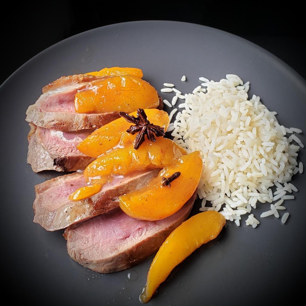 Servir les magrets détaillés en tranches, accompagnés de pêches confites et d’un filet de jus. Servir avec du riz.