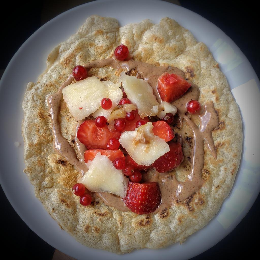 Servir sur une assiette. Découper quelques fruits de saison et ajouter une cuillère de purée d’amandes sur le dessus. Déguster.