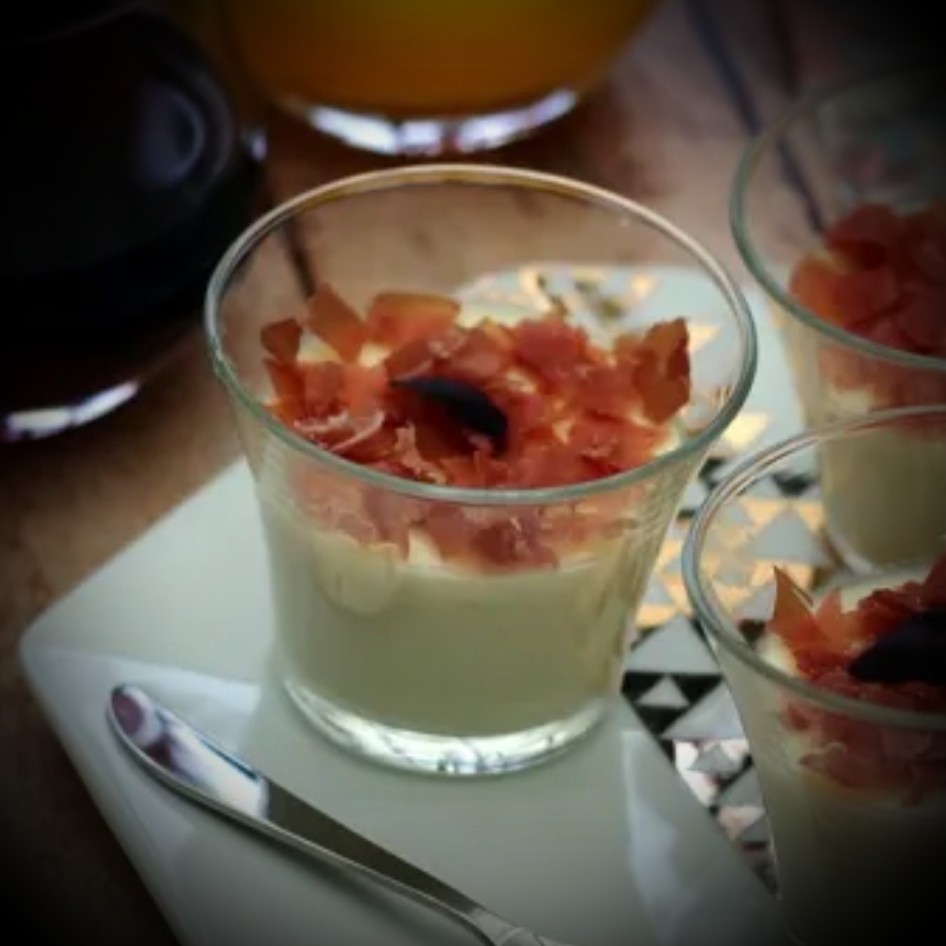 Au moment de servir, couper le jambon en petits dés. Décorer les verrines sur le dessus et ajouter quelques pistaches concassées.