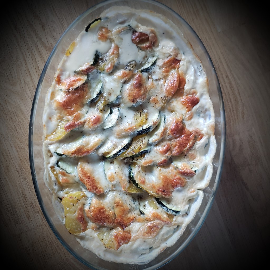 Rincez les courgettes et coupez-les en rondelles. Coupez la mozzarella en tranches. Préparez un moule à gratin en le beurrant légèrement. Déposez au fond les oignons en une couche. Par-dessus, alternez les tranches de pommes de terre et les rondelles de courgettes. Salez et poivrez à nouveau, et répartissez la seconde cc de thym et d’ail en poudre. Recouvrez de crème liquide et de tranches de mozzarella, et parsemez de parmesan pour avoir un côté un peu plus gratiné.