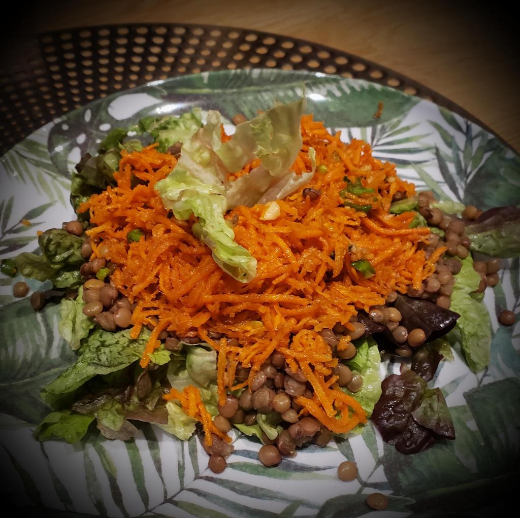 Servir dans l’assiette quelques feuilles de salade, ajouter les lentilles, puis les carottes râpées, parsemer de basilic le persil.