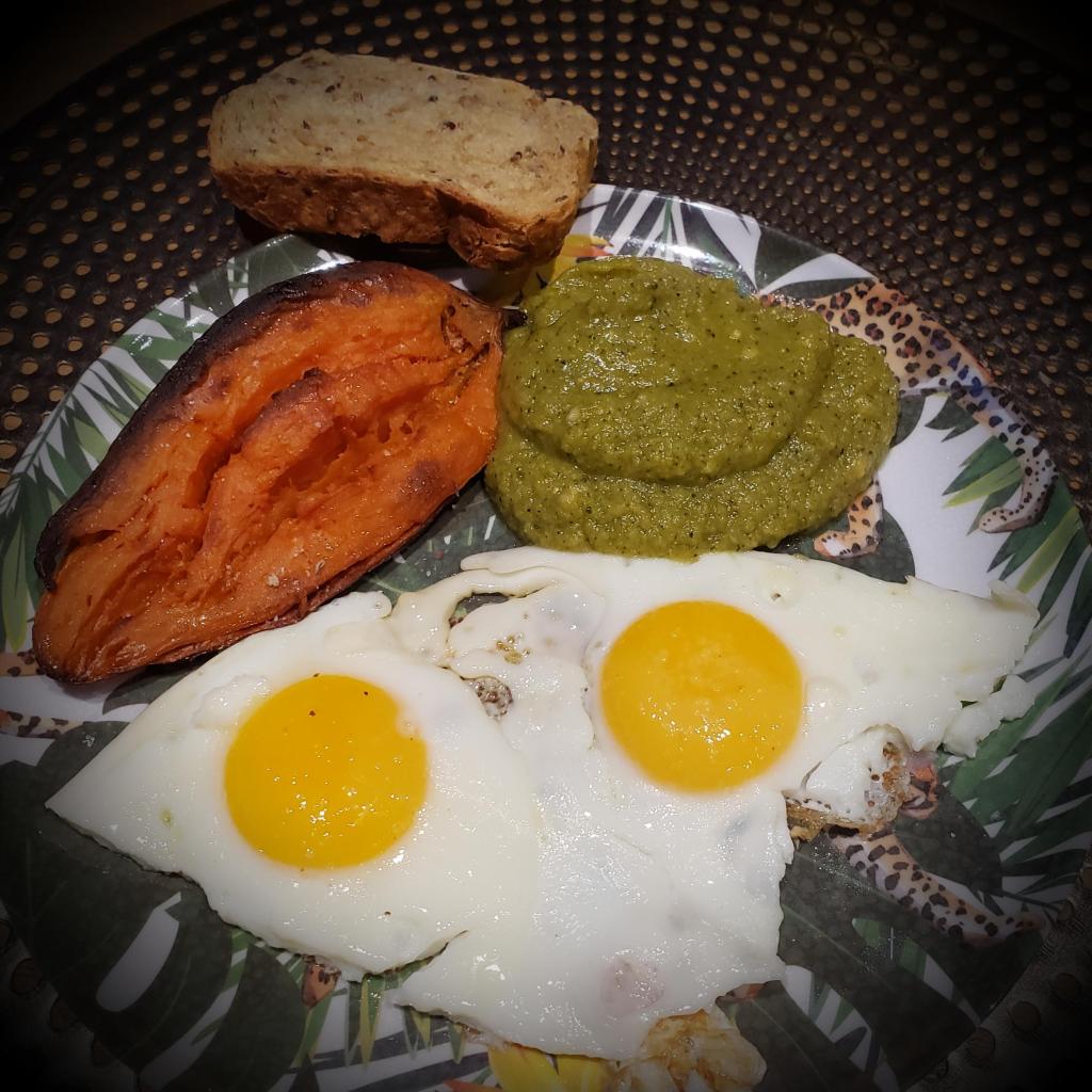 Servir la patate douce dans l’assiette, ajouter la purée et les œufs au plat. Déguster.