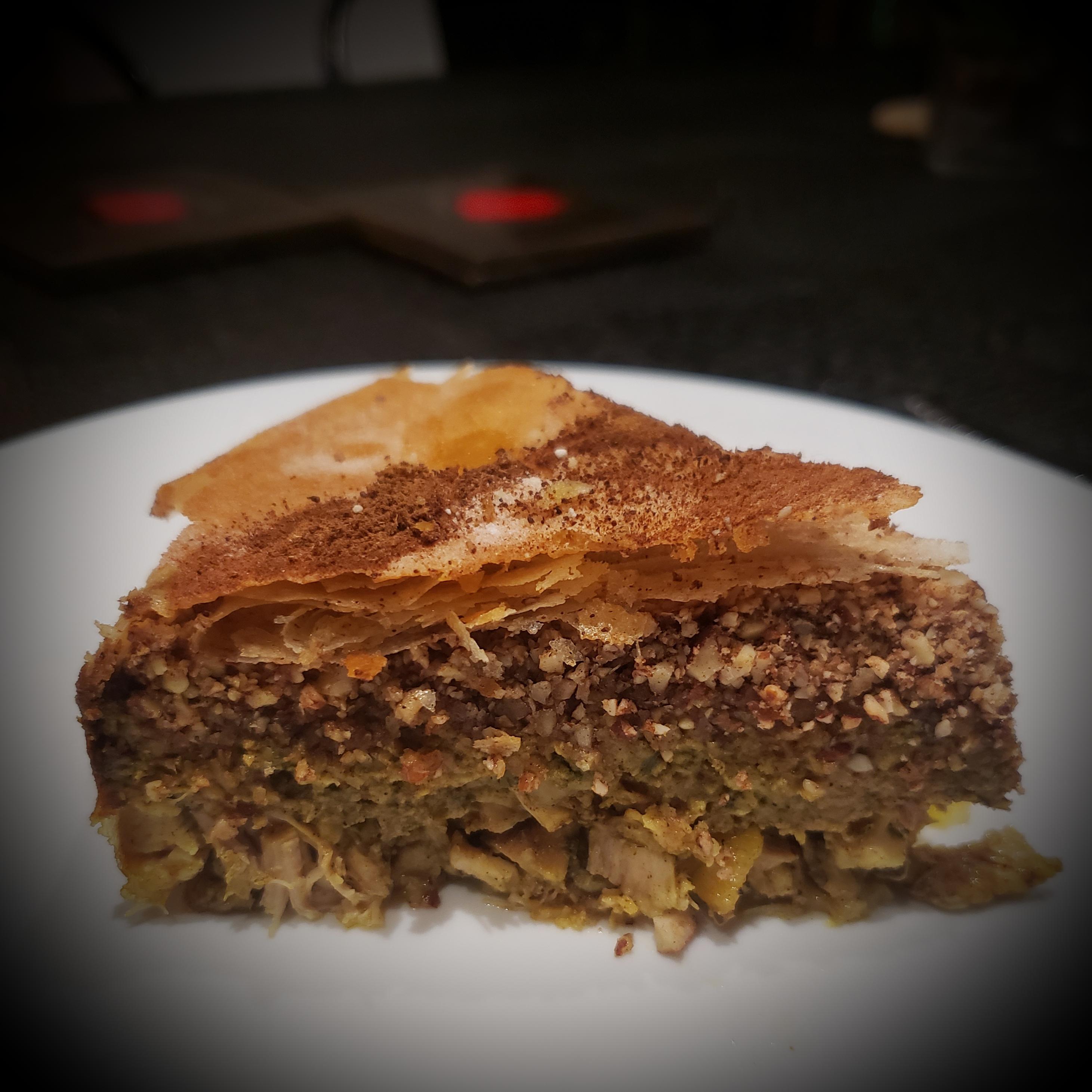 Prendre un moule rond et haut et le beurrer. Déposer au fond, 3 feuilles de brick badigeonnées de beurre fondu en les faisant se chevaucher et en les faisant largement dépasser du moule. Déposer successivement le poulet effiloché, la préparation à l’omelette puis les amandes. Replier vers l’intérieur les bords des feuilles de brick qui dépassent. Ajouter 2 autres feuilles de brick sur le dessus et bien replier le tout pour que la pastilla soit bien étanche et fermée. Enfourner 30min.