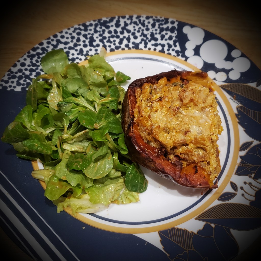 Remplir les 2 faces de butternut évidées avec le mélange. Saupoudrer de parmesan et enfourner 15min.