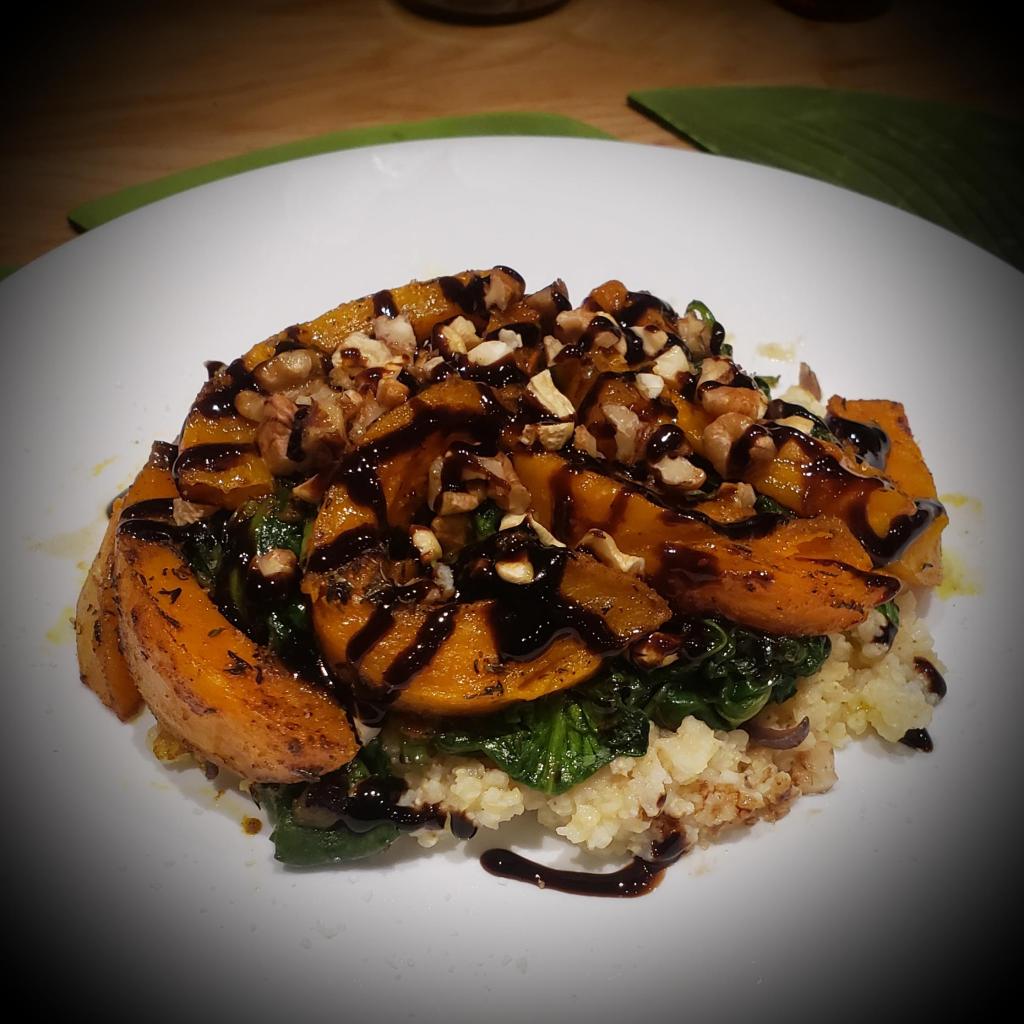 Servir le millet dans une assiette, ajouter les épinards, les tranches de potimarron rôtis, ajouter les noix hachées sur le dessus. Arroser le tout d’huile d’olive et de velours de balsamique. Déguster.