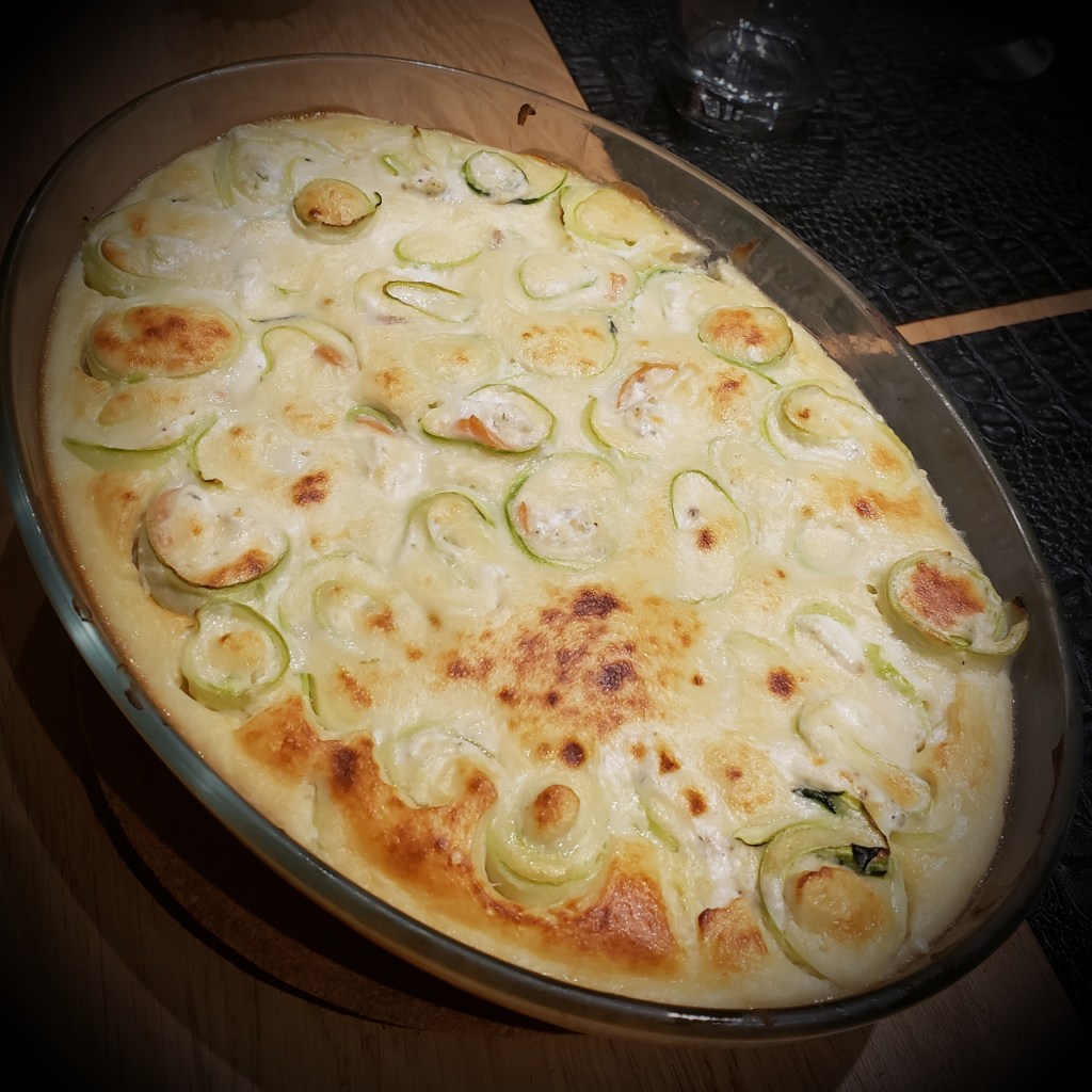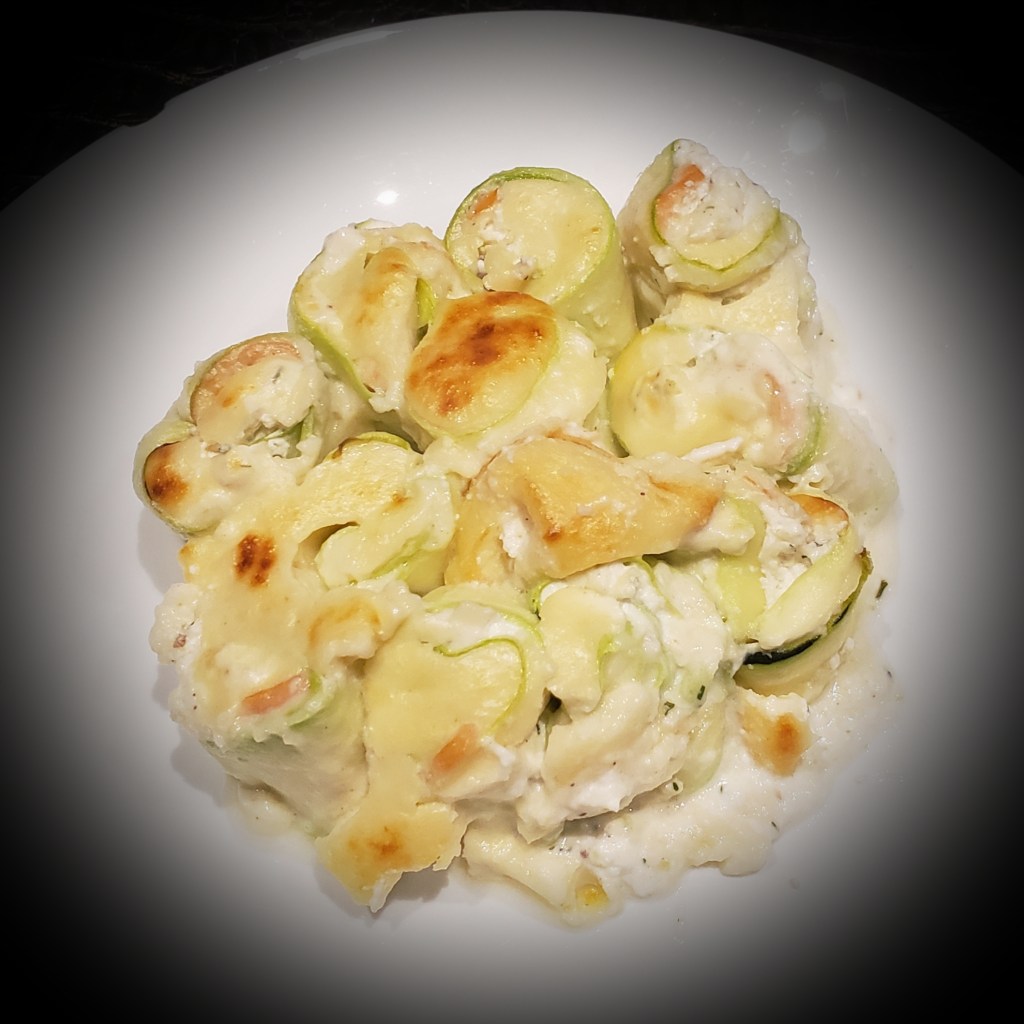 Déposer quelques bandes à plat (en superposant a minima 3 lamelles de courgettes par bande), ajouter un petit rectangle de saumon et de la brousse. Former des rouleaux et les déposer au fur et à mesure dans un plat à gratin.