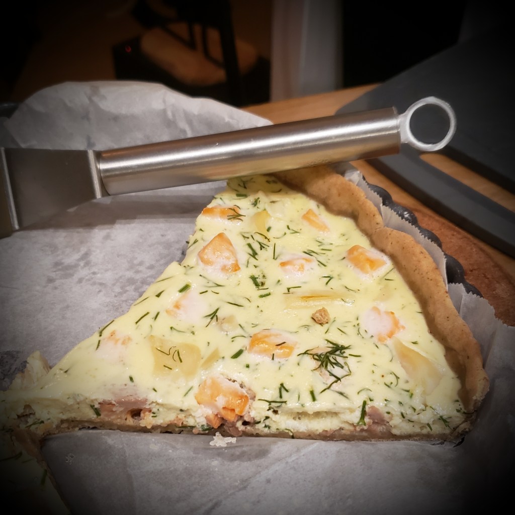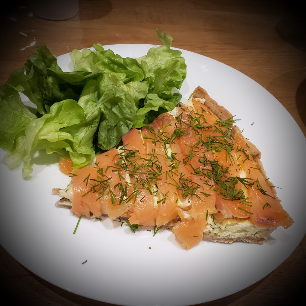 A la sortie du four, disposer des lanières de saumon fumé sur le dessus, ciseler de l’aneth fraîche. Déguster avec une belle salade verte.