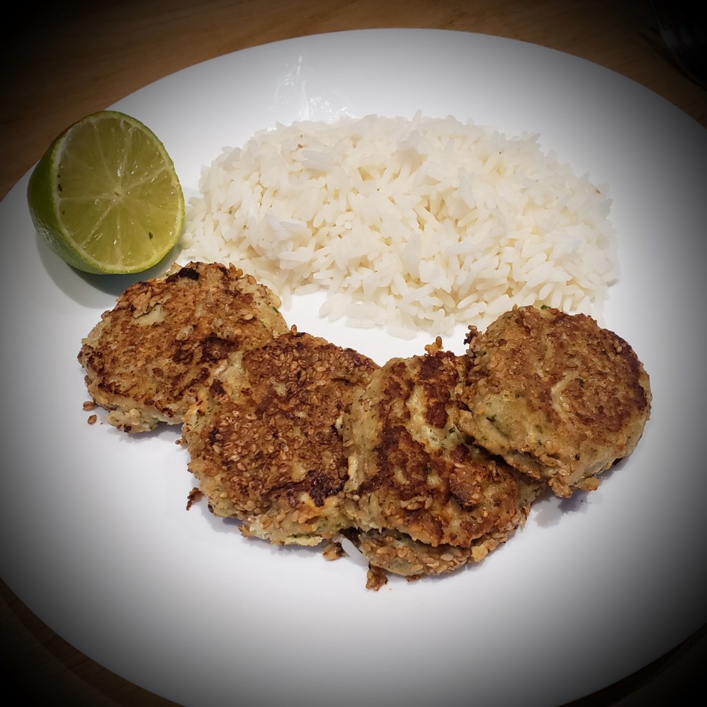 Former des petites boules avec 2 cuillères à soupe, les rouler dans des graines de sésame et les faire revenir dans une poêle avec un filet d’huile de sésame en les écrasant un peu.