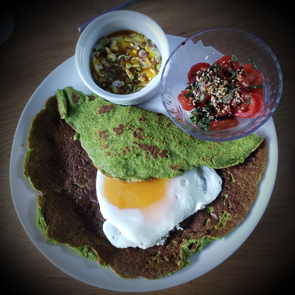 Servir une crêpe, ajouter un œuf au plat dessus et déguster avec le yaourt grec et la salade de tomate comme un wrap. Déguster.
