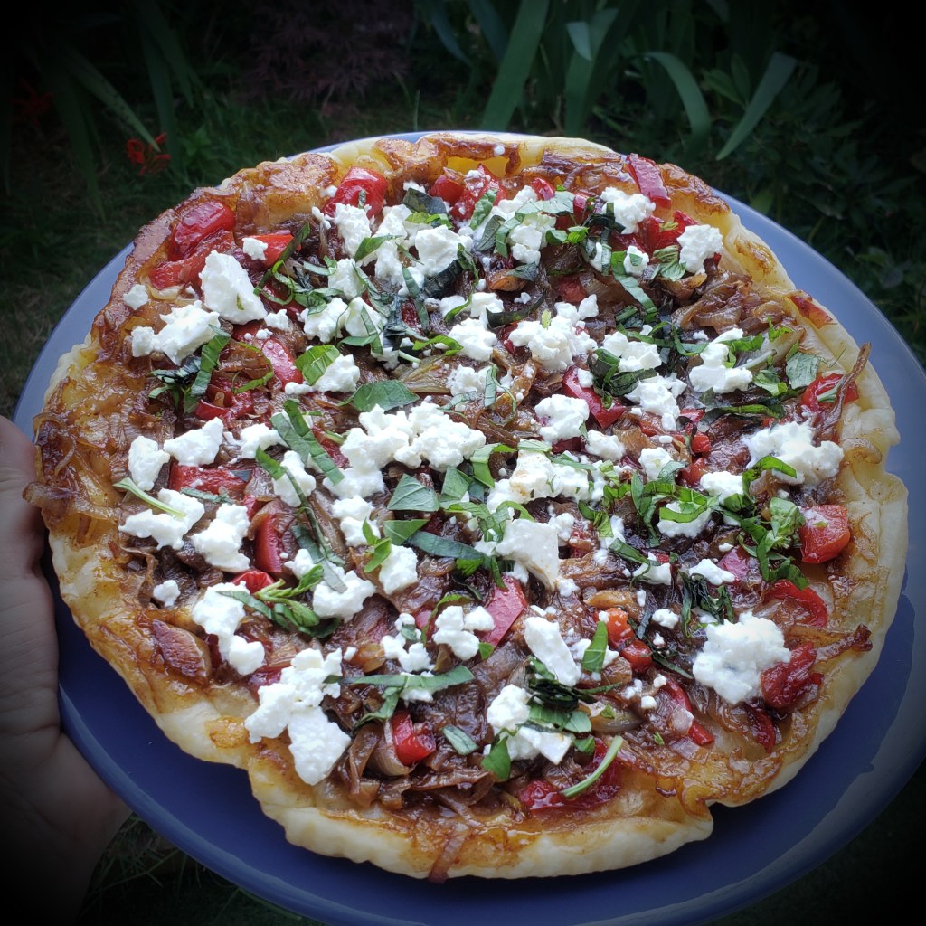 A la sortie du four, retourner la tatin sur un plat. Émietter la feta et ciseler du basilic.