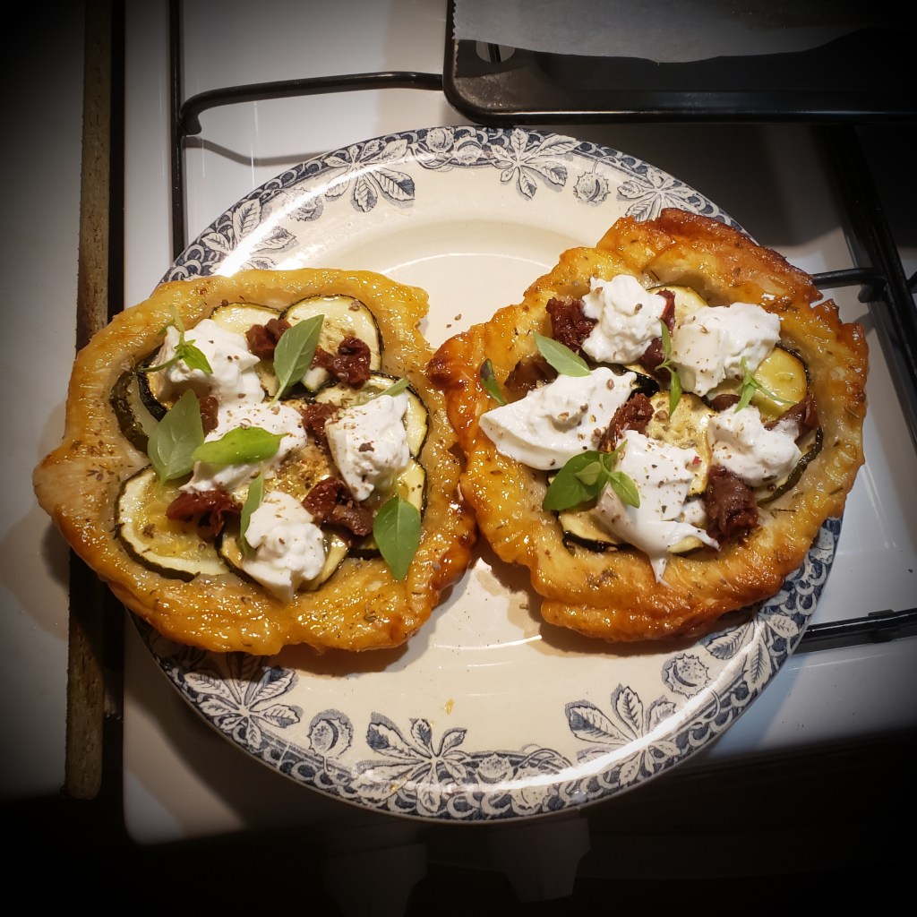 Couper la pâte feuilletée en 4 et recouvrir les rondelles de courgettes en rentrant bien les bords. Piquer à la fourchette et enfourner 30min.