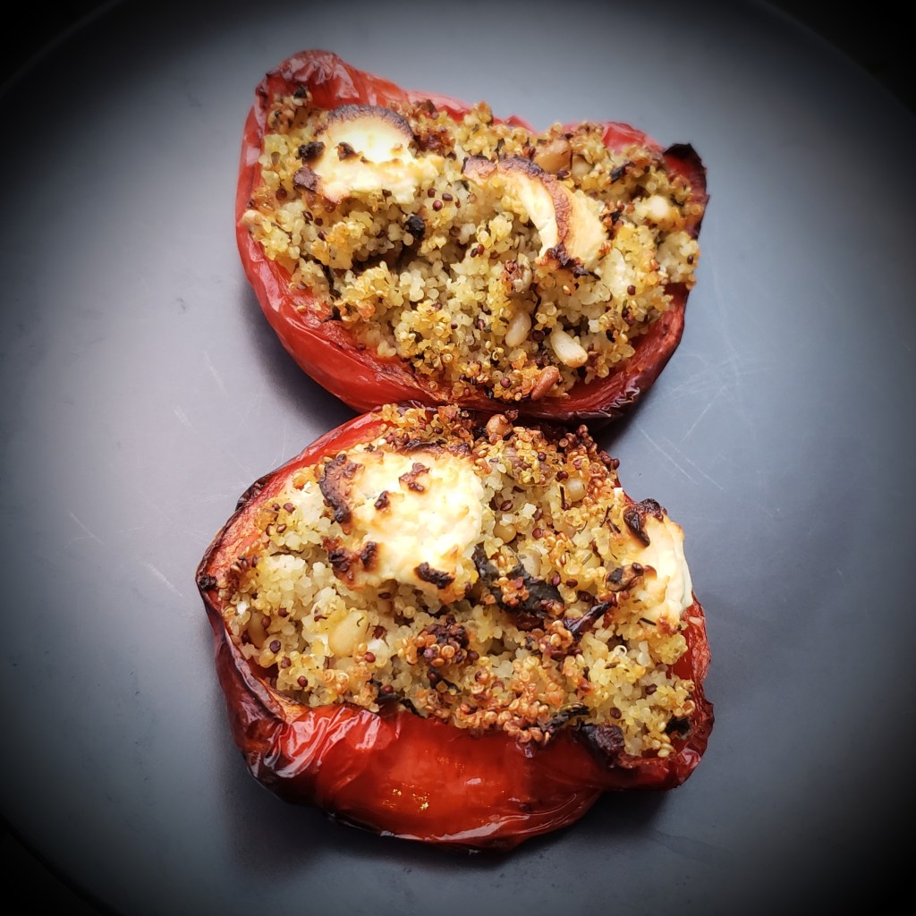 Farcir les demi poivrons avec une cuillère du quinoa. Ajouter des noisettes de fromage frais à l’aide d’une petite cuillère. Recouvrir de quinoa. Ajouter sur le dessus encore un peu de fromage frais (2-3 noisettes). Enfourner 30 minutes.