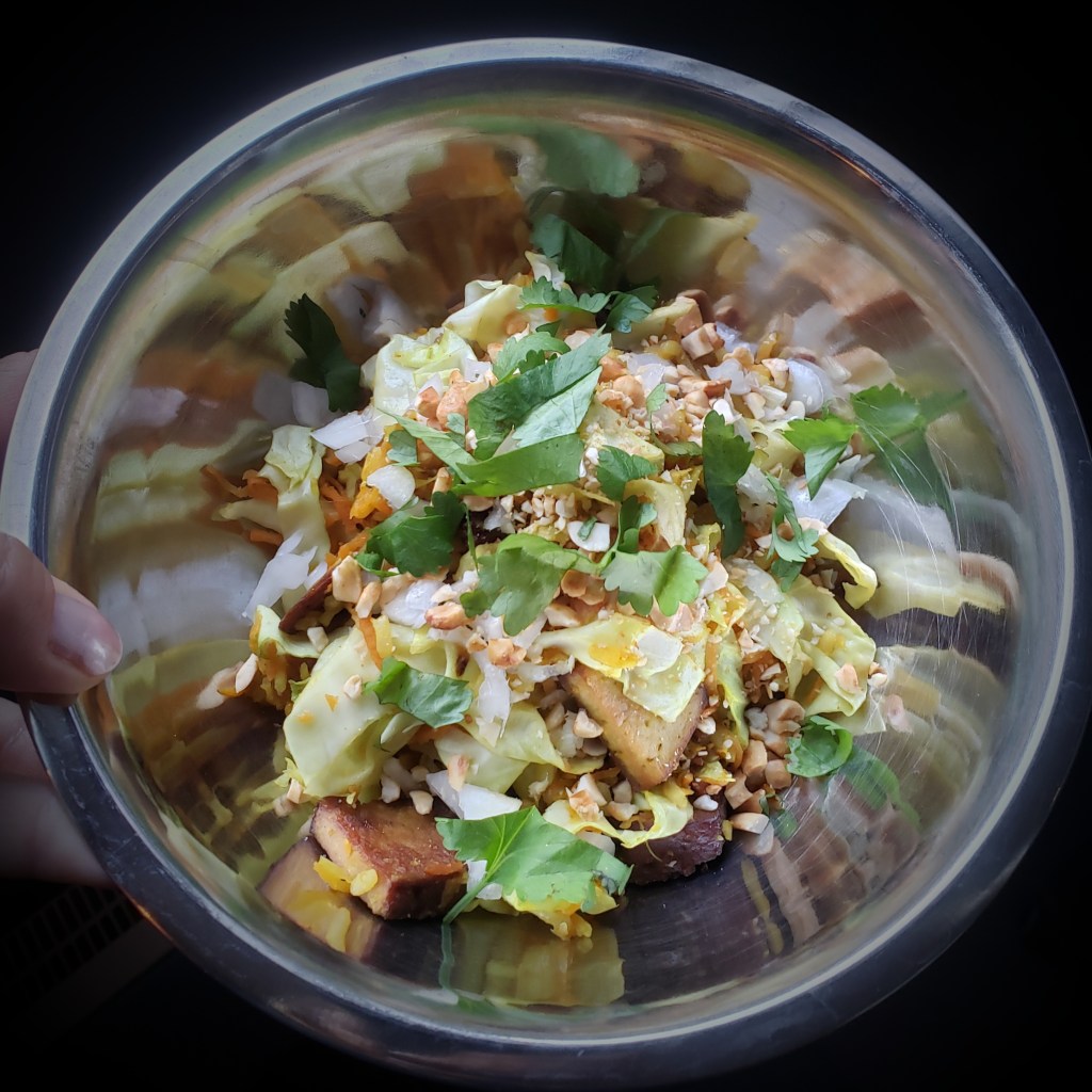 Dans une poĂȘle, verser un peu d’huile de coco et faire revenir le tofu coupĂ© en petits morceaux pendant 5min pour qu’il soit bien dorĂ©. RĂ©server.
