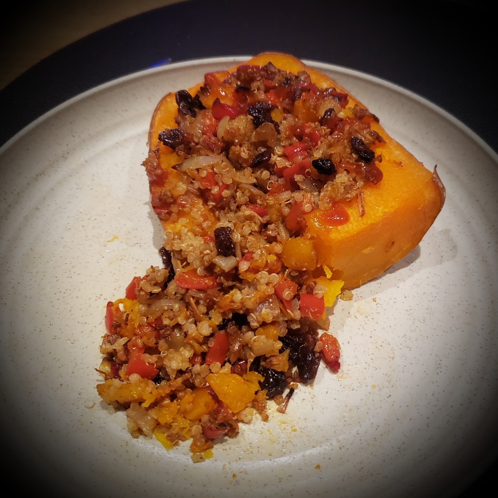 Remplir chaque morceau de butternut avec le mélange. Enfourner 25 minutes (ou plus si nécessaire, jusqu’à ce qu’un couteau puisse s’enfoncer facilement dans la chair).