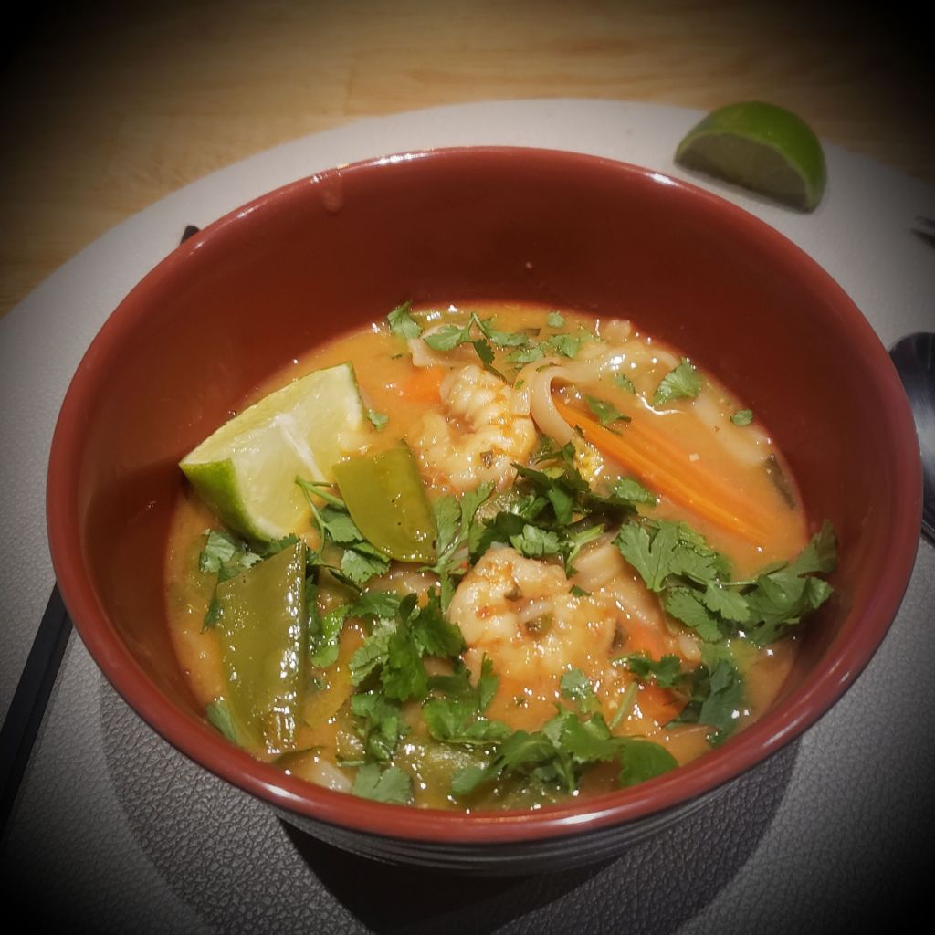 Enlever les têtes de crevettes et remplacer par les corps des crevettes fraîches. Ajouter les pois gourmands coupés en 2, les carottes coupées en bâtonnets et les nouilles. Prolonger la cuisson.