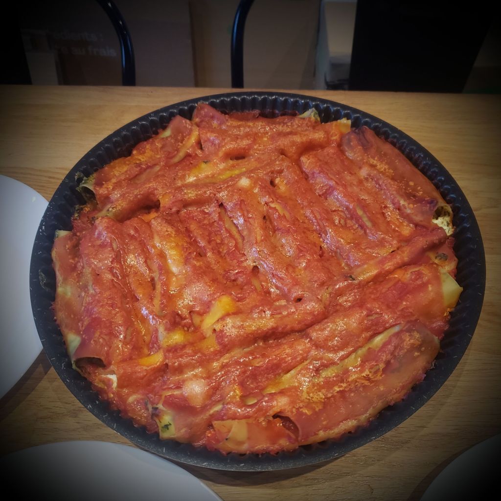 Prendre une poche à douille (ou sinon un sac de congélation). Remplir du mélange et faire un trou (petit) sur l’un des coins. Prendre les cannelloni un à un et les remplir. Les ranger dans un plat.