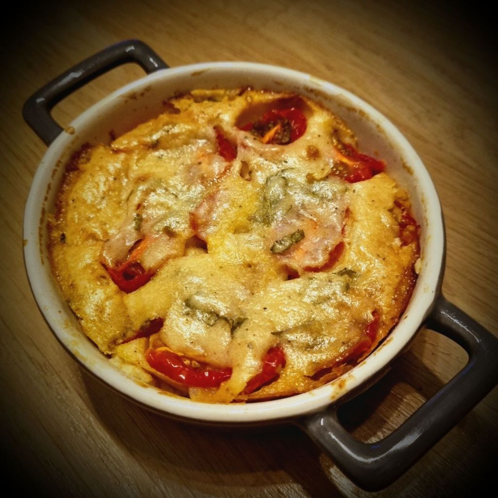Couper les tomates en 2 et les disposer dans des petits moules sur 1 couches. Verser le mélange sur le dessus. Enfourner 25min