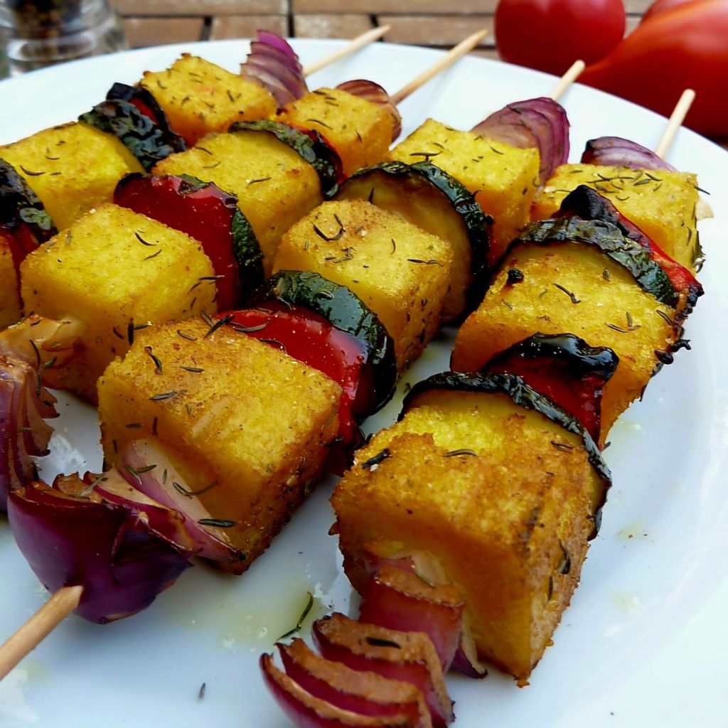 Couper la polenta refroidie en gros cubes. Sur des pics à brochette, alterner légumes tranchés et polenta.