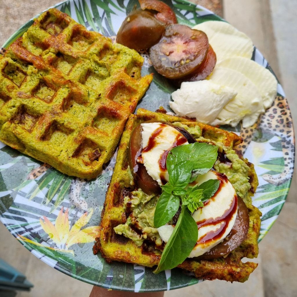 Disposer les gaufres sur une assiette, étaler du guacamole, poser sur le dessus les tranches de tomate et de mozza. Ajouter un filet de velours de balsamique, un filet d’huile d’olive, saler et poivrer et ciseler du basilic.