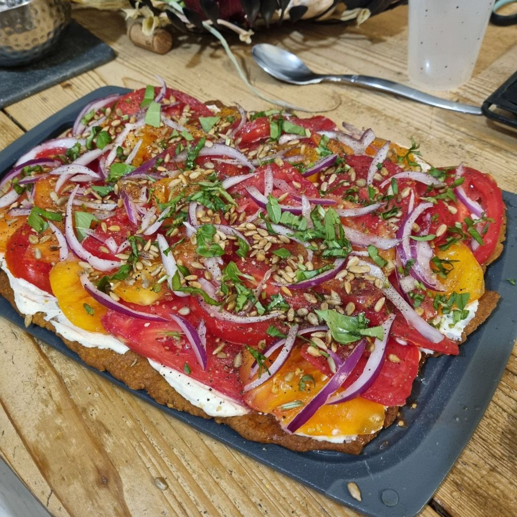 Déposer ensuite les rondelles de tomates joliment, les anneaux d’oignon rouge. Faire griller les oignons de pin et les saupoudrer sur le dessus.